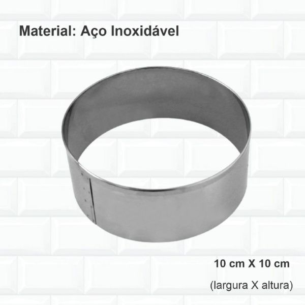 Aro cortador redondo fabricado em aço inoxidável, resistente à corrosão e fácil de limpar. Perfeito para modelagem e corte preciso de massas, pães e sobremesas. Diâmetro: 10cm, altura: 10cm. Indicado para confeitarias, restaurantes e uso doméstico. Cor: prateado. Tags: cortador redondo, modelador, inox, confeitaria.