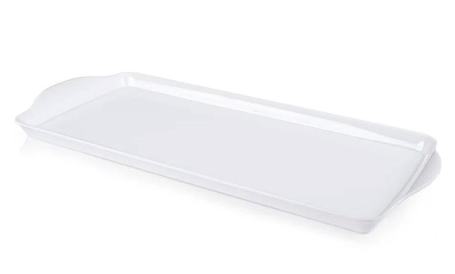 Bandeja de melamina com abas, ideal para servir ou expor alimentos, com tamanho de 38x16cm.