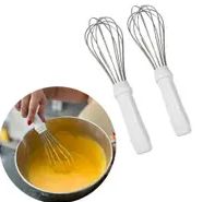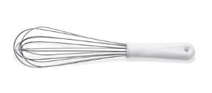 Batedor tipo fouet de 25cm com cabo branco em polipropileno, ideal para misturar e aerar massas leves e claras em receitas diversas.