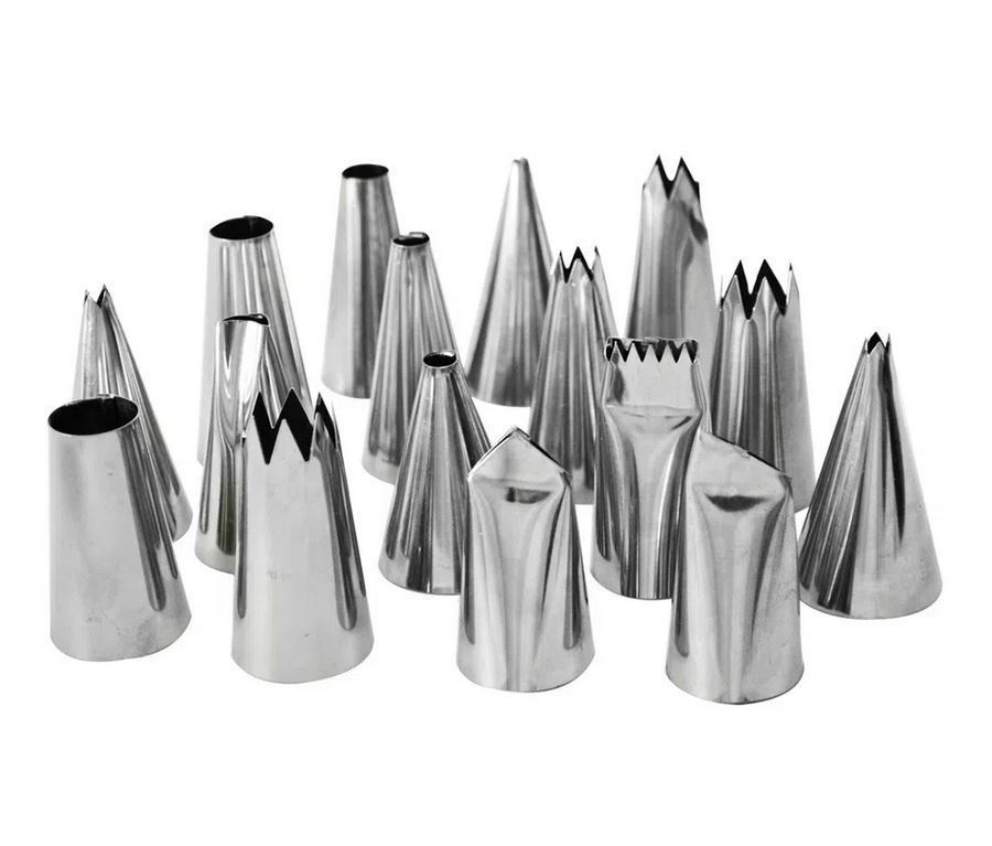 Kit com 16 bicos de confeitar em inox para decorar bolos e doces.