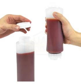 Bisnaga em polietileno resistente, formato invertido e tampa de fechamento automático. Facilita o uso comercial em restaurantes, lanchonetes e cozinhas profissionais. Capacidade: 720ml. Cor: Transparente. Tags: bisnaga ketchup, bisnaga mostarda, embalagem squeeze, dosador de condimentos.