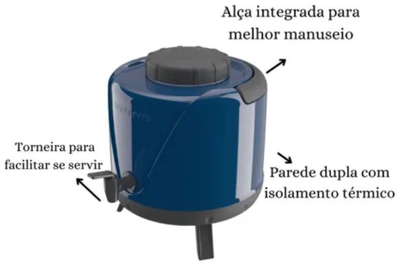 Botijão térmico fabricado em polipropileno, capacidade de 5 litros, ideal para conservar líquidos quentes ou frios por várias horas. Cor azul. Indicado para uso doméstico, eventos e viagens. Tags: térmico, garrafão, recipiente isotérmico, conservador de temperatura.