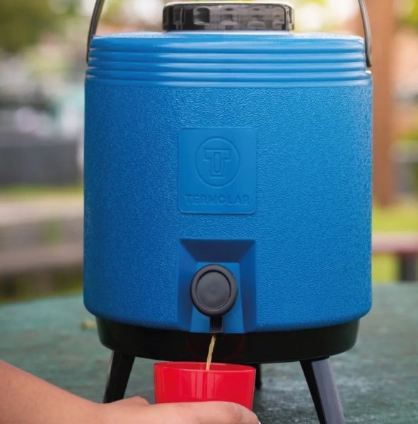 Botijão térmico 8L azul, ideal para conservar líquidos quentes ou frios por horas, com torneira prática. Do fabricante Termolar, linha Maxitermo.