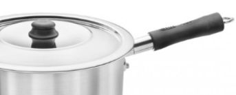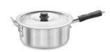 Caçarola de alumínio polido com tampa encaixada e cabo de baquelite, resistente ao calor, indicada para preparo de grandes receitas em cozinhas industriais ou residenciais. Capacidade aproximada: 6,5 litros. Cor: prata. Tags: panela de alumínio, panela hotel, panela profissional, cozimento, utensílio culinário.