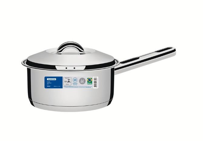 Caçarola Tramontina em aço inox, linha Solar, com cabo ergonômico, capacidade para 1,4L, diâmetro de 16cm, altura de 8cm. Uso doméstico e profissional. Cor: inox. Tags: panela, caçarola, inox, cabo, cozinha, Tramontina.