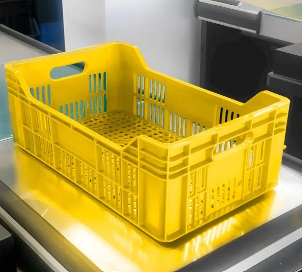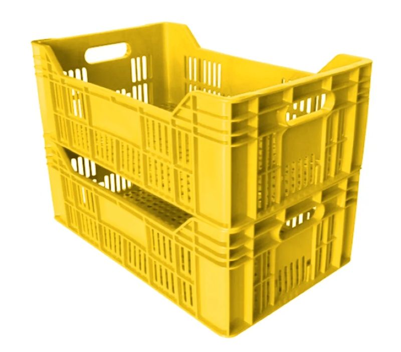 Caixa plástica vazada empilhável Bolivar de 54x34x30 cm, ideal para armazenar alimentos ou objetos.