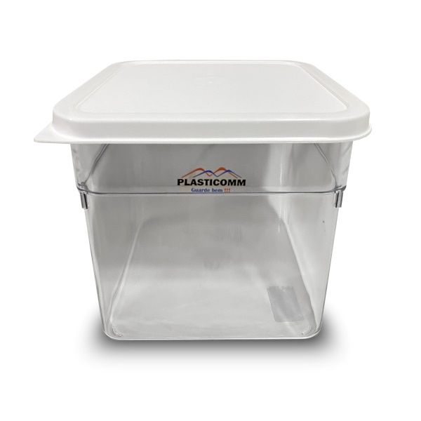 Caixa plástica quadrada Plasticomm, fabricada em polipropileno resistente, capacidade de 6 litros, dimensões 22x22x18 cm. Ideal para armazenamento doméstico ou comercial de alimentos, utensílios ou objetos diversos. Cor: translúcida. Tags: pote plástico, caixa organizadora, pote armazenamento.