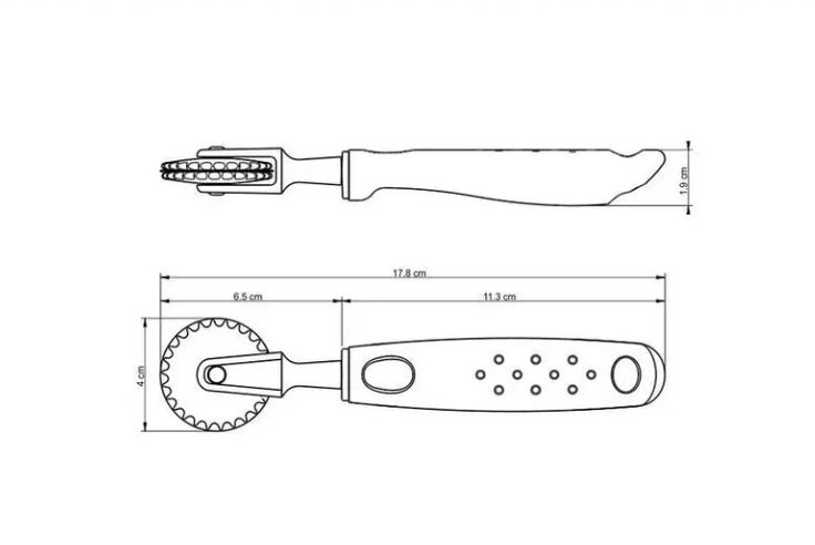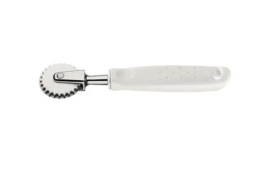 Carretilha para cortar e fechar massas, ideal para preparo de pastéis e raviolis. Fabricada em aço inox com cabo branco.