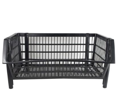 Cesta expositora preta Bolivar, fabricada em polietileno resistente, ideal para organização e exposição comercial de produtos em supermercados, lojas ou feiras. Medidas: 40x58x29cm. Cor: preta. Sinônimos: cesta organizadora, cesta para loja, expositora de produtos.
