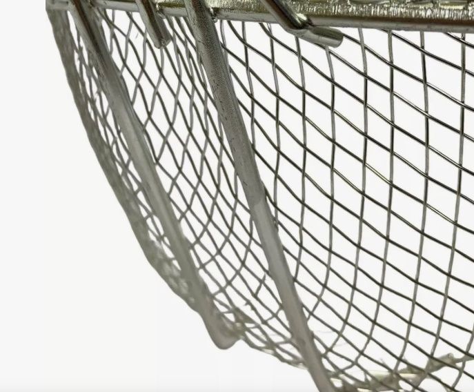 Cesta para fritura redonda em aço inox, ideal para fritar alimentos com segurança. Medidas 35x9cm. Fácil de limpar.