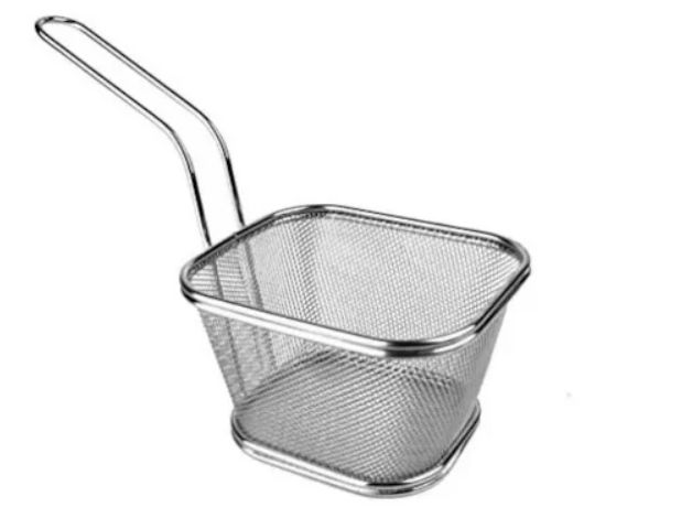 Cestinha para porções feita em aço inox, formato quadrado. Ideal para servir batatas, frituras e petiscos em bares ou restaurantes. Medidas: 10x6cm. Resistente, fácil de limpar. Cor: prata. Tags: cestinha, porções, petisco, inox, serviço de mesa.