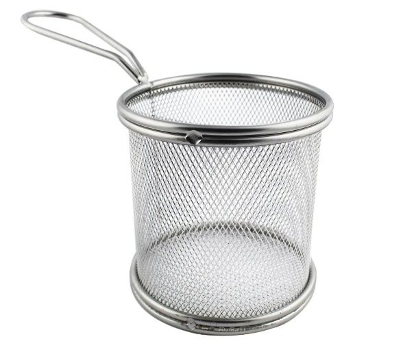 Cestinha para porções em inox, ideal para servir alimentos fritos, medindo 8,5x9cm, perfeita para restaurantes e bares.
