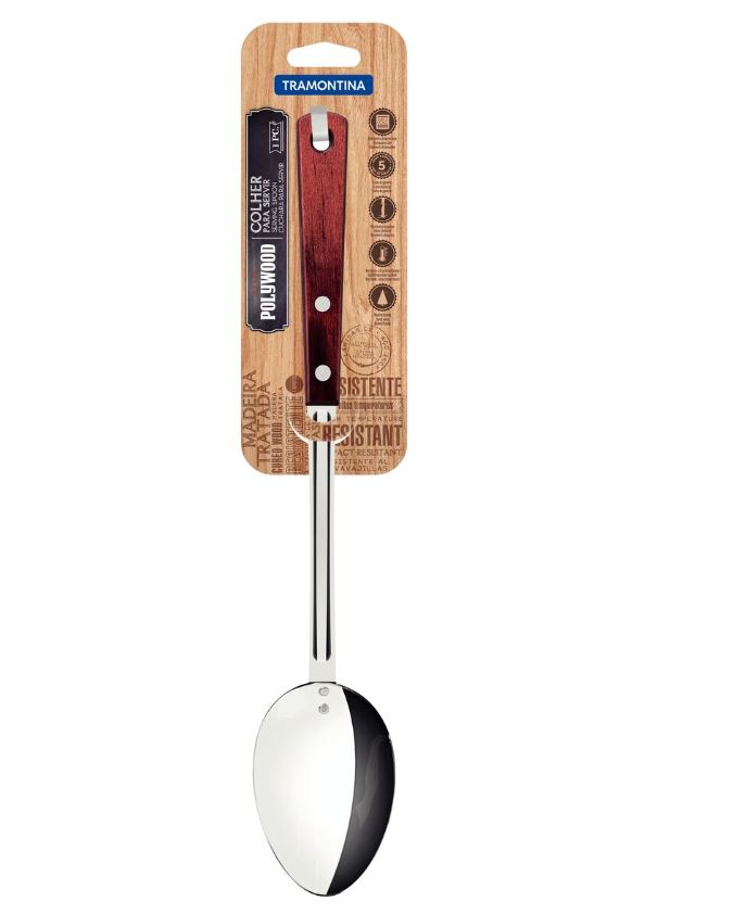 Colher produzida em aço inox com cabo de madeira tratada (Polywood), altamente durável, resistente a impactos, perfeita para uso intensivo em restaurantes, buffets e cozinhas industriais. Comprimento: 34 cm. Cor: madeira natural. Tags: colher de arroz, utensílio profissional, servir arroz, Tramontina Polywood.