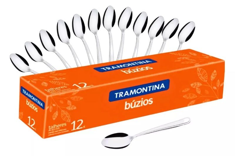 Colher de mesa Tramontina Búzios em aço inox, acabamento polido, ideal para uso diário em restaurantes e residências. Material resistente e fácil de limpar, não solta resíduos. Comprimento: 19,6 cm. Cor: prata. Tags: talher, colher, inox, Tramontina Búzios.
