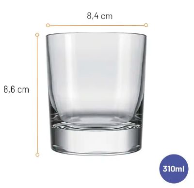 Copo de vidro Brooklyn Rocks 310ml, caixa com 24 unidades. Ideal para bares, restaurantes e uso residencial.