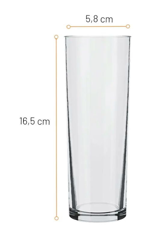 Copo de vidro tubular 320ml, ideal para coquetéis, refrigerantes e água. Caixa com 24 unidades.