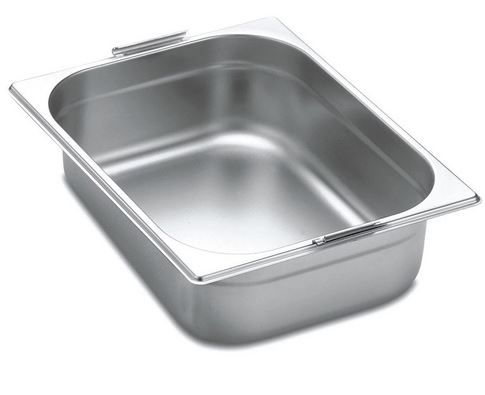 Cuba gastronômica em aço inox, tamanho 1/2x100 com alça, ideal para bufês, cozinhas e self-services. Medidas: 32,5x26,5x10cm.