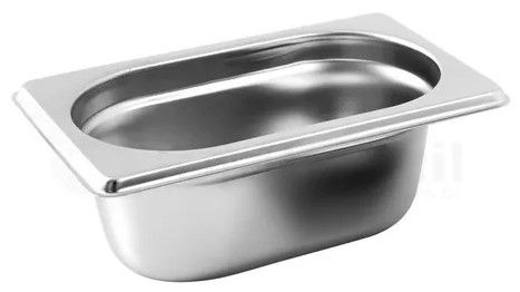 Cuba GN em aço inox para uso em restaurantes, lanchonetes e buffets. Resistente à corrosão, fácil de limpar, suporta altas temperaturas. Capacidade padrão GN 1/9x65 (17,5x10,8x6,5cm). Cor: Inox. Tags: cuba gastronômica, GN, bandeja, recipiente inox, cozinha profissional.