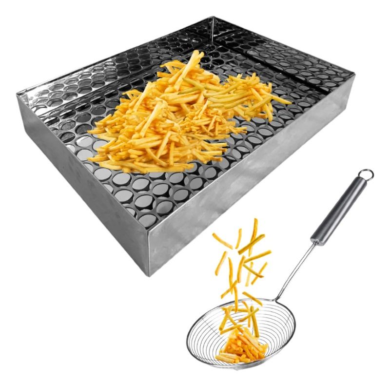 Escorredor de pastéis em inox, ideal para restaurantes, lanchonetes e cozinhas industriais, resistente e fácil de limpar, dimensões 32x41cm.