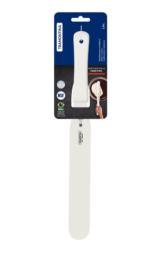 Espátula Tramontina para confeitaria, lâmina em aço inox, cabo branco em polipropileno, 8” (20 cm). Indicada para aplicação, nivelamento e acabamento de bolos e doces. Leve e ergonômica. Cor: branco. Tags: espátula confeitaria, espátula bolo, utensílios confeiteiro.
