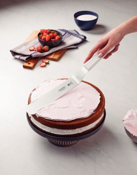 Espátula curva para confeiteiro Tramontina de 10 pol., ideal para alisar e decorar bolos, com cabo branco ergonômico.