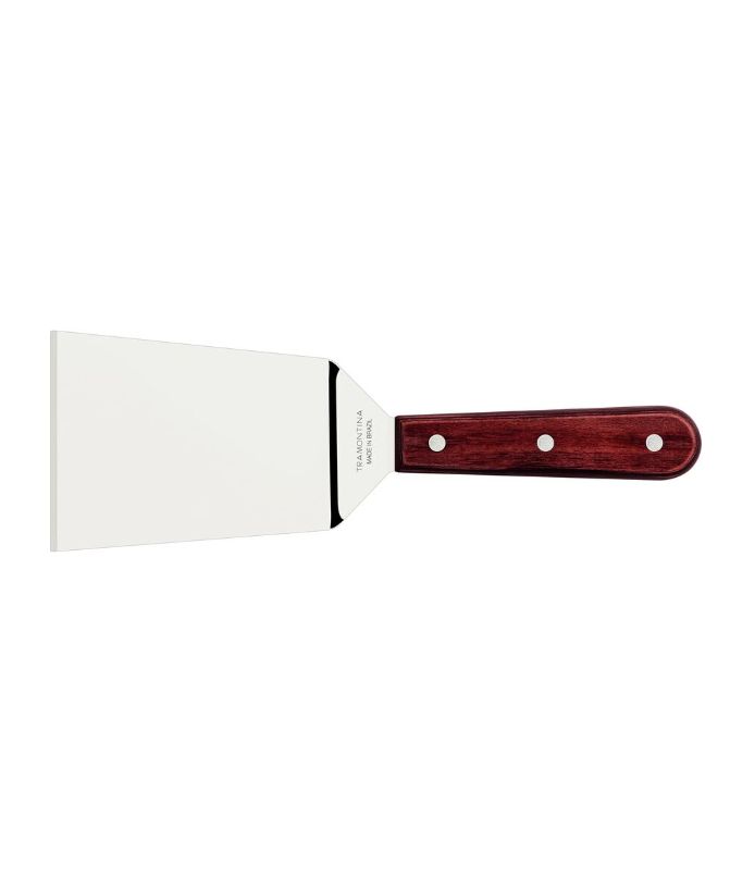 Espátula profissional em aço inox com cabo de madeira Polywood fixado por rebites de aço inox, resistente a impactos e altas temperaturas. Ideal para manusear hambúrgueres em chapas e grelhas. Comprimento total aproximado: 39,2 cm. Indicado para uso comercial e doméstico. Cor: madeira natural. Tags: espátula, utensílio churrasqueira, lanche, hambúrguer, Tramontina Polywood.