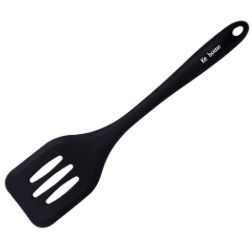 Espátula de silicone vazada para fritura com 30cm, ideal para uso em panelas antiaderentes, resistente ao calor, cabo ergonômico, cores sortidas, Kehome Ref. 6041.