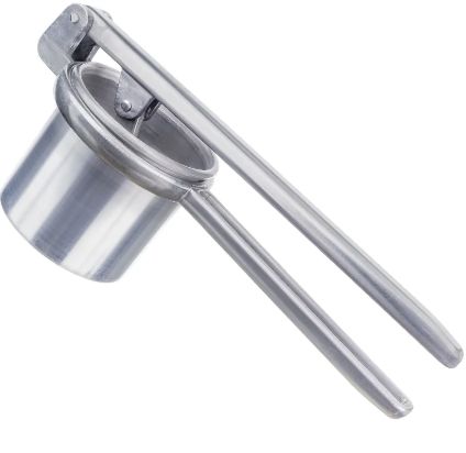 Espremedor de batatas grande em alumínio polido, ideal para uso doméstico e profissional.