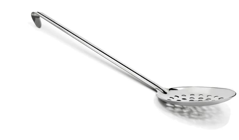 Espumadeira em aço inoxidável de 34cm com gancho, ideal para retirar alimentos fritos ou cozidos, prática e resistente.