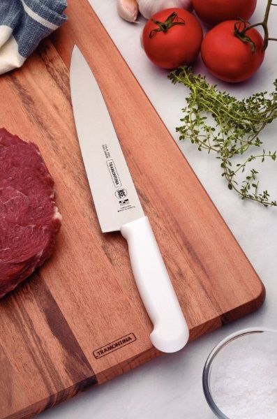 Faca de cozinha profissional Tramontina com lâmina em aço inox de 8" para cortes precisos, cabo em polipropileno branco, resistente e fácil de higienizar. Ideal para uso doméstico e profissional. Medidas: 32x3,8x2 cm. Cor: branco. #faca #tramontina #inoxidável #cozinha #profissional
