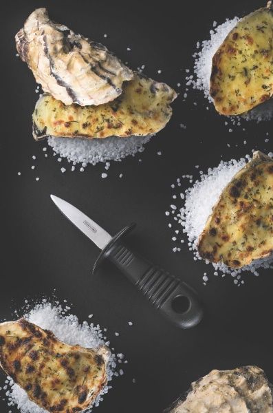 Faca para abrir ostras Tramontina, com lâmina de aço inox e 4 polegadas de comprimento, cabo ergonômico em polipropileno. Indicada para restaurantes, bares e uso doméstico. Perfeita para shucking ostras e frutos do mar. Cor: Preto. Medidas: comprimento da lâmina 10 cm. Tags: faca ostras, cutelaria, frutos do mar, utensílio cozinha.