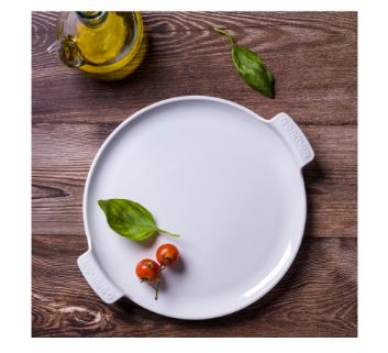 Forma de pizza em porcelana branca com asas, perfeita para servir e assar pizzas em pizzarias, restaurantes e lares. Medidas: 31 cm de diâmetro. Material: porcelana resistente, fácil de limpar, cor branca. Tags: forma de pizza, prato para pizza, Germer, porcelana.