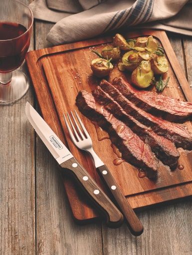 Garfo de mesa Tramontina Polywood Jumbo com lâmina em aço inox e cabo resistente de madeira tratada. Ideal para refeições diárias ou churrascos. Comprimento aproximado 21,8 cm. Cor: marrom. Tags: garfo jantar, talher Tramontina, linha Polywood.
