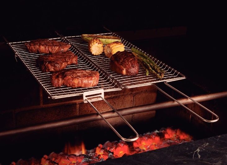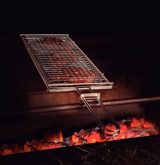 Grelha dupla abaulada, em inox, para churrasco, tamanho 75x19cm, ideal para preparo uniforme de carnes.