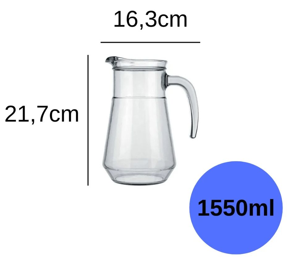 Jarra de vidro transparente Nadir Figueiredo Ref. 5414, capacidade de 1550ml. Perfeita para servir água, sucos e bebidas em restaurantes, bares e residências. Material resistente, fácil de limpar, design clássico. Dimensões aproximadas: 22cm (altura) x 13cm (diâmetro). Cor: transparente. Tags: jarra de água, jarra de suco, jarra vidro 1,5L, utensílio de bar, servir bebidas.