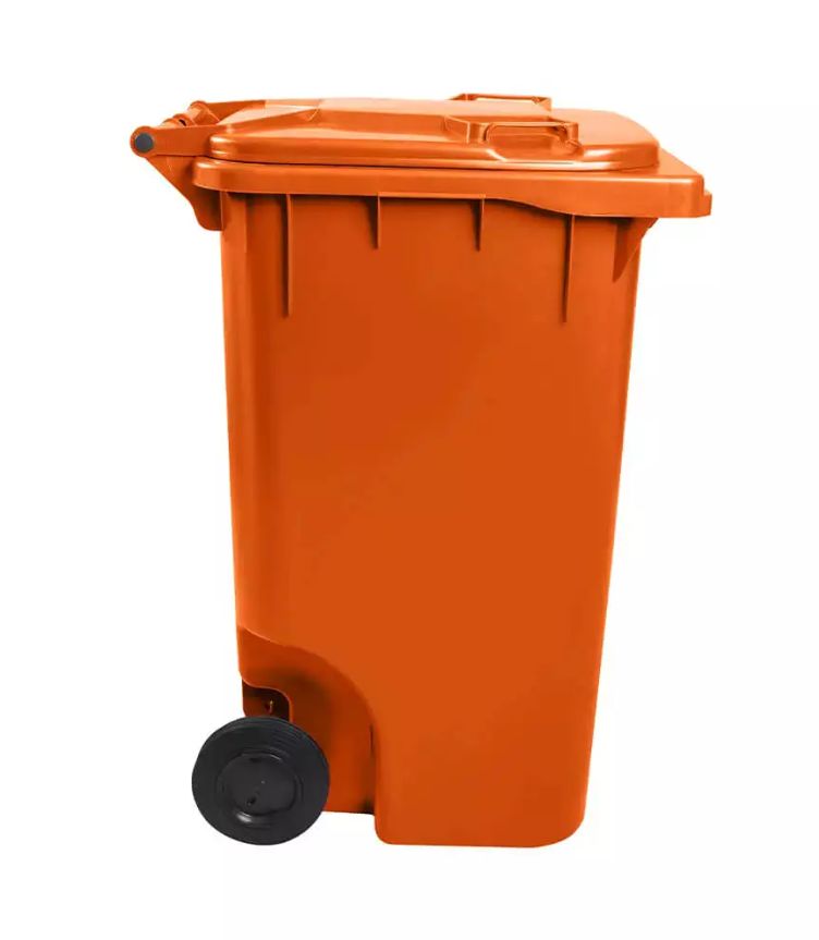 Lixeira contentora fabricada em polietileno de alta densidade, resistente a impactos, com tampa articulada e rodas para fácil transporte. Capacidade de 240L. Cor: Laranja. Ideal para estabelecimentos comerciais, condomínios, áreas industriais e uso domiciliar. Tags: lixeira grande, recipiente para lixo, lixeira coleta seletiva, lixeira industrial, lixeira resistente.