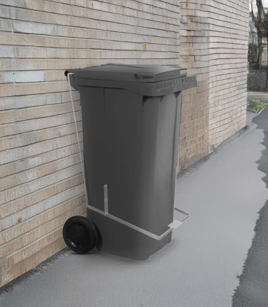 Lixeira contentora cinza de 120 litros com pedal, ideal para descarte eficiente de resíduos em ambientes comerciais.