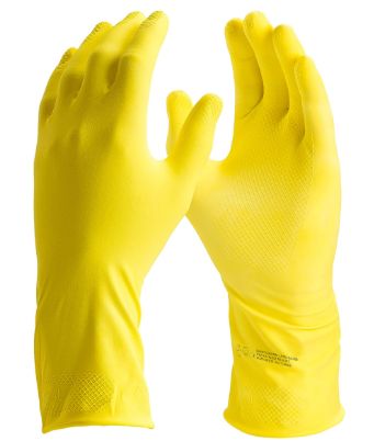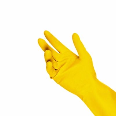 Luva de látex multiuso tamanho G na cor amarela, ideal para proteção em tarefas domésticas e profissionais.
