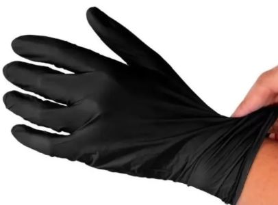 Luva nitrílica descartável preta tamanho M, caixa com 100 unidades. Ajuste confortável, resistente e ideal para proteção nas tarefas de limpeza ou manipulação.