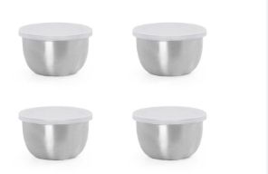 Mini tigela de inox com tampa, 8cm de diâmetro, capacidade 200ml, prática para servir ou armazenar alimentos.