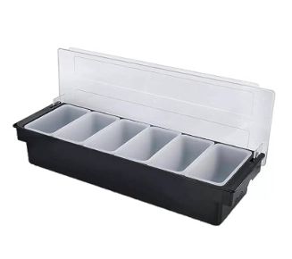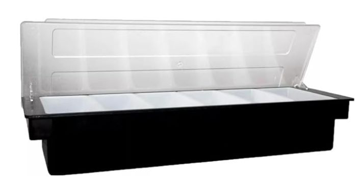 Organizador de bar com 6 divisórias em plástico resistente, ideal para bares e restaurantes.