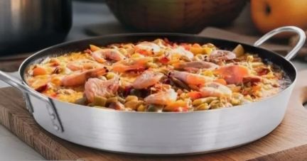 Paelleira em alumínio com revestimento antiaderente teflon, 40cm, ideal para preparo de paellas e pratos diversos.