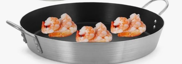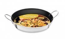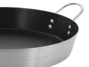 Paelleira de alumínio com revestimento antiaderente, ideal para preparo de paellas e pratos variados. Diâmetro de 50cm, fácil de limpar, leve e resistente.