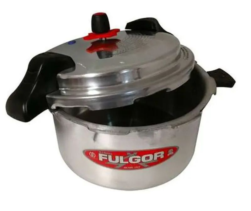 Panela de Pressão Fulgor em alumínio polido, capacidade de 15 litros, com alças ergonômicas para fácil transporte. Uso comercial e doméstico, perfeita para grandes volumes no preparo de alimentos. Cor: alumínio/prata. Tags: panela de pressão, panela industrial, panela grande, panela cozinha profissional, preparo rápido.