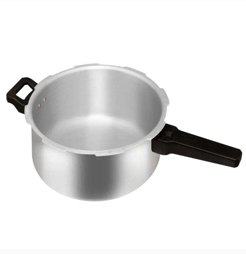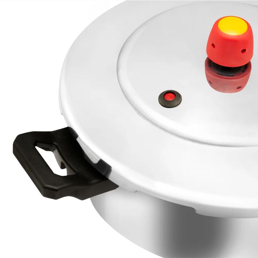 Panela de pressão Eirilar 10 litros com fecho externo, acabamento polido e alta resistência.