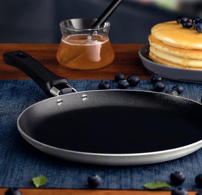 Panquequeira em alumínio revestida com teflon, diâmetro 24cm. Ideal para preparar panquecas e crepes com praticidade.