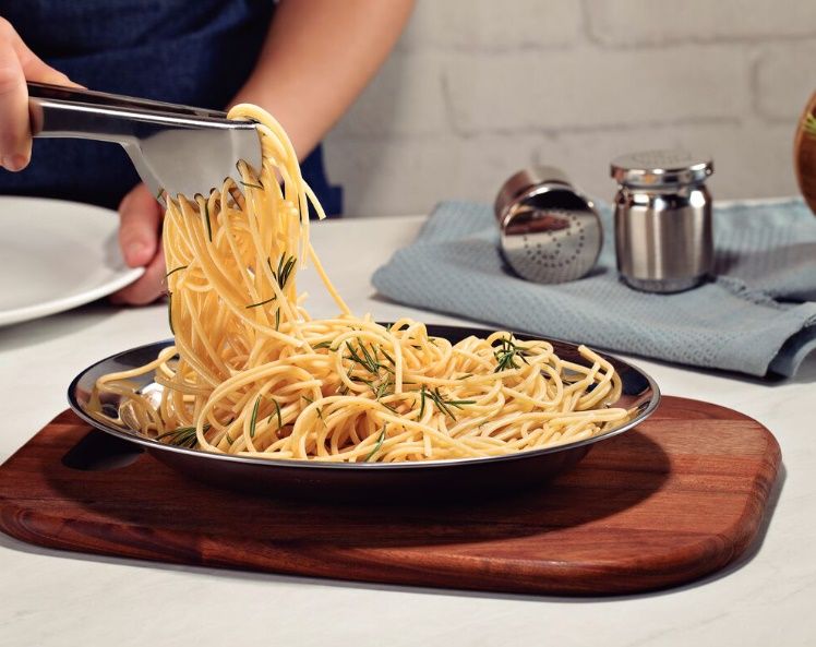 Pegador de massas em aço inox com formato de garra, resistente e durável, ideal para servir macarrão e espaguete.