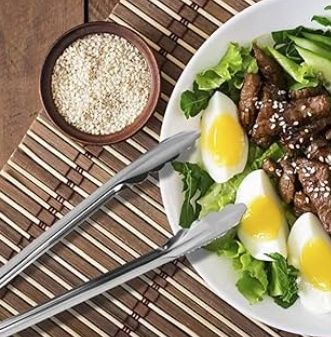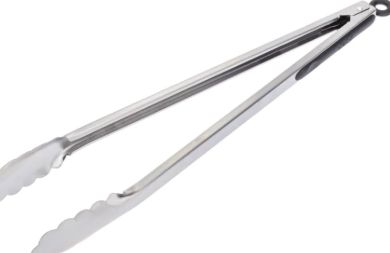 Pegador universal em aço inox com mola, ideal para grelhar e servir alimentos. Comprimento 40cm, resistente, prático e fácil de limpar.