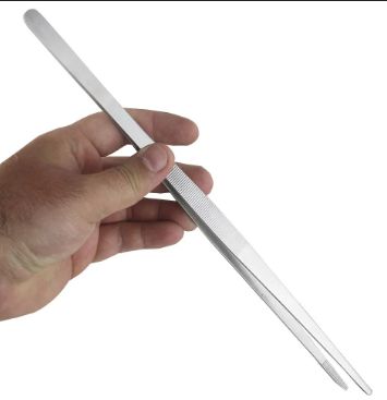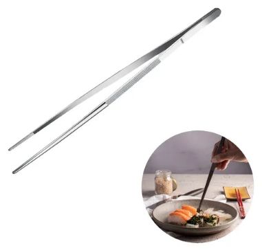 Pinça culinária em inox 30cm, ideal para manipulação segura de alimentos.