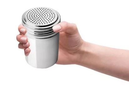 Polvilhador em aço inox, resistente à corrosão. Ideal para polvilhar sal, açúcar ou canela. Uso doméstico ou profissional. Cor: inox. Dimensões aproximadas: 6x9cm. Tags: saleiro, polvilhador, temperos, cozinha.